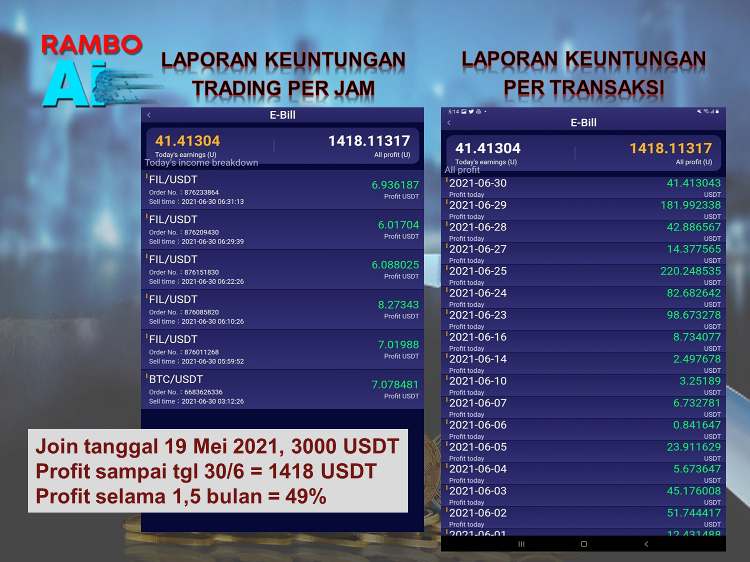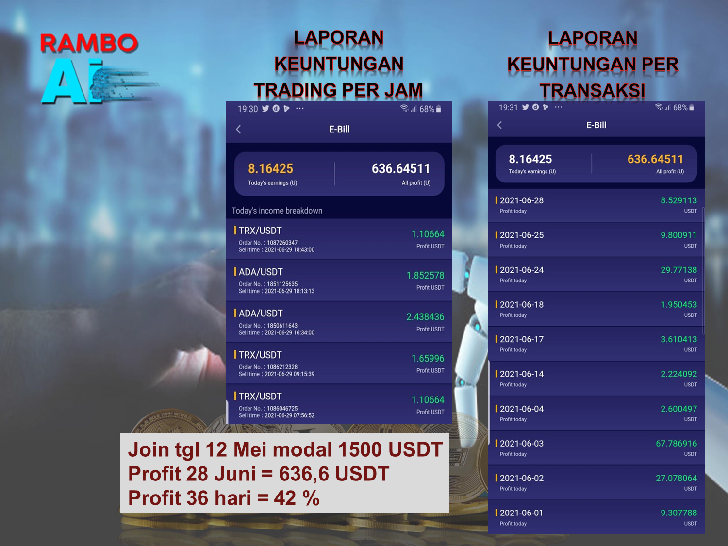 • Rambo AI akan bekerja 24 jam,7 hari tiada henti sampai mencapai target profit yang telah ditentukan atau tanggal expirenya.