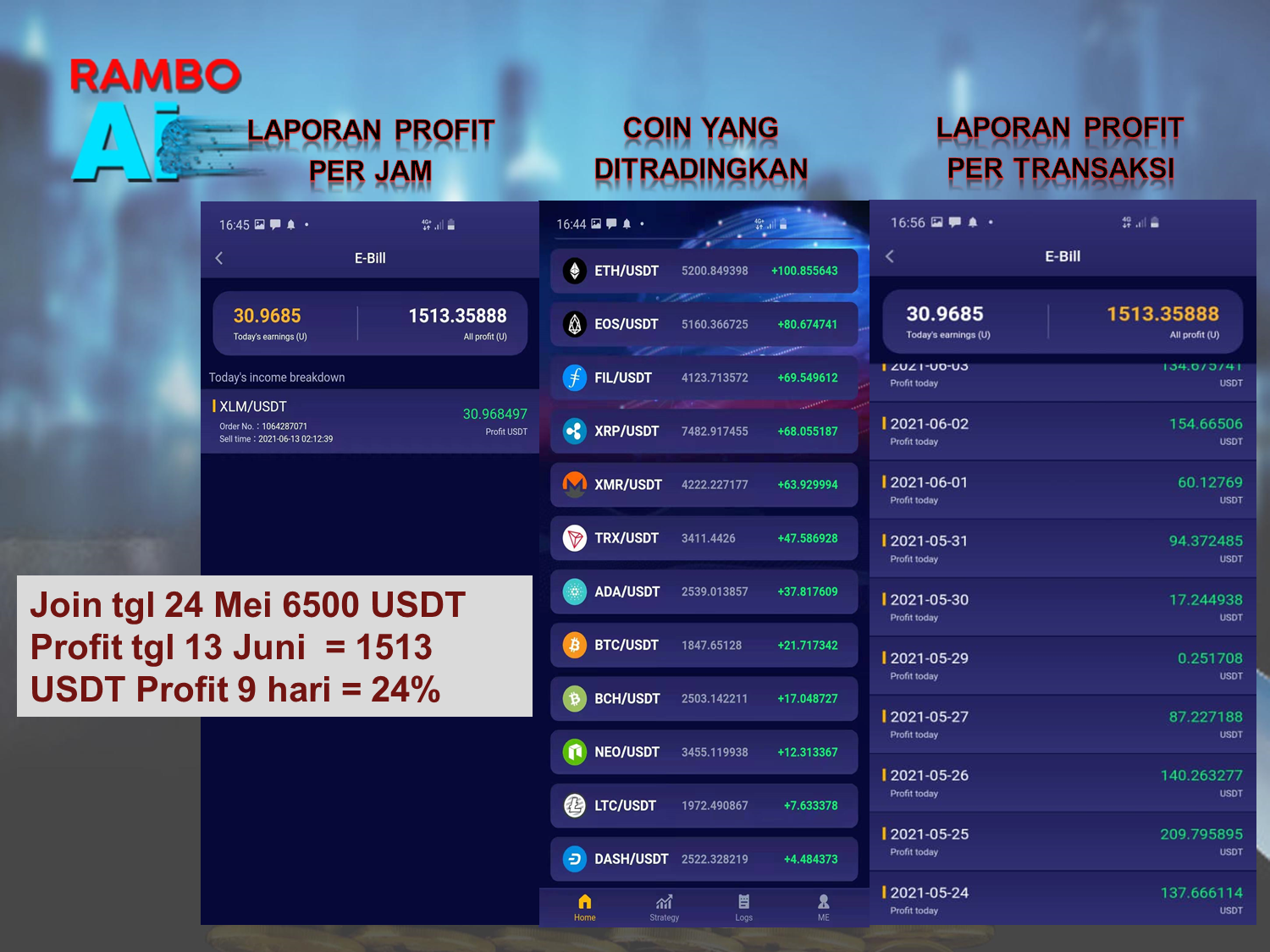 • TERUJI OLEH TEAM HEBAT: Dengan menggunakan cryptobot tercanggih 3.0 dan diawasi ketat oleh team crypto trading yang berpengalaman maka Rambo AI pertama di dunia memberikan hasil jaminan keuntungan dalam setiap detik.